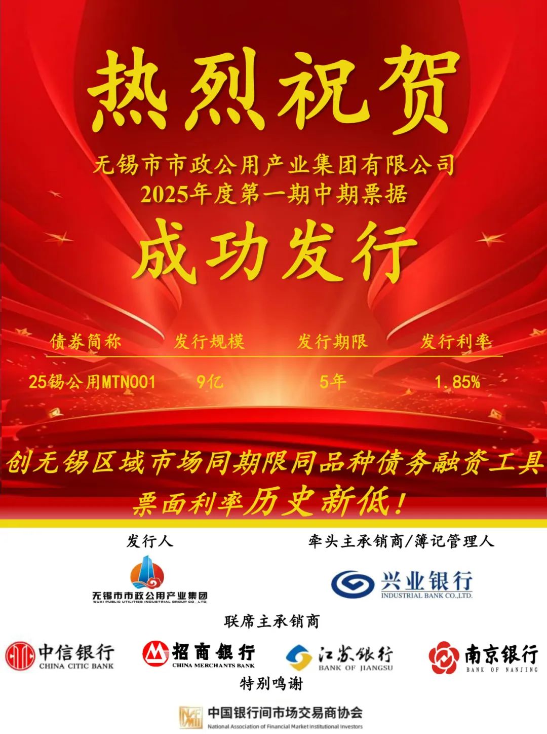 7月10日,集团成功发行2025年度第一期中期票据,发行规模9亿元,期限5年,票面利率1.85%,由兴业银行、中信银行、招商银行、江苏银行、南京银行共同承销。本期中期票据吸引了投资者广泛关注,发行票面利率创无锡区域市场同期限同品种债务融资工具的历史新低,充分体现了金融市场对集团综合实力和发展前景的高度认可,同时也为集团后续高质量发展奠定了坚实的基础。